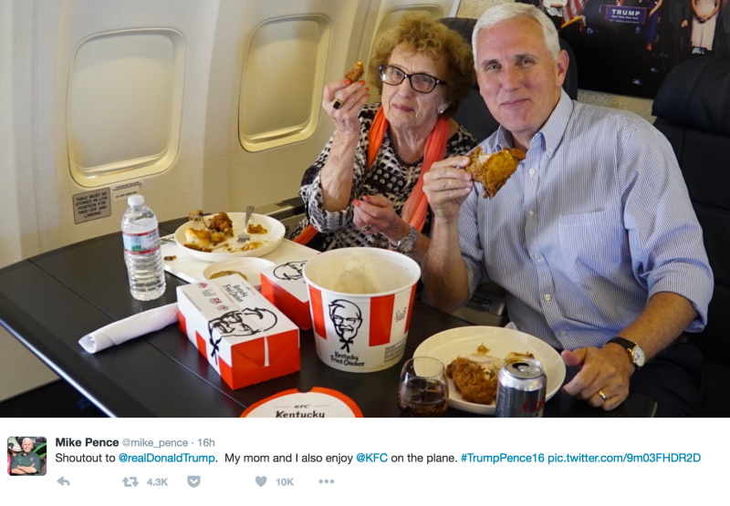 Pence tweeted the picture of him and his beloved, captive mother as a callback to Trump’s own KFC tweet from earlier this month.