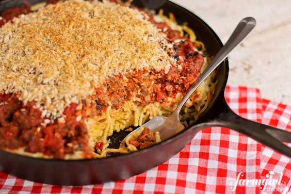 - Transfer spaghetti to skillet. Top with mozzarella. Set aside.